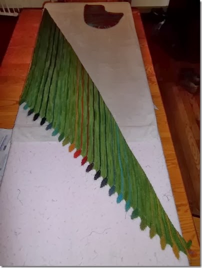 I finished the Leftie Shawl while I was gone. I had a hard time weaving in the colored ends from the leaves – it looked so sloppy – but with some expert guidance from my friend Sue in NH I was able to finish it off nice and neat. I think I’m going to start hunting for a good ‘finishing’ book for knitting as I don’t think Sue will come to visit every time I need help.